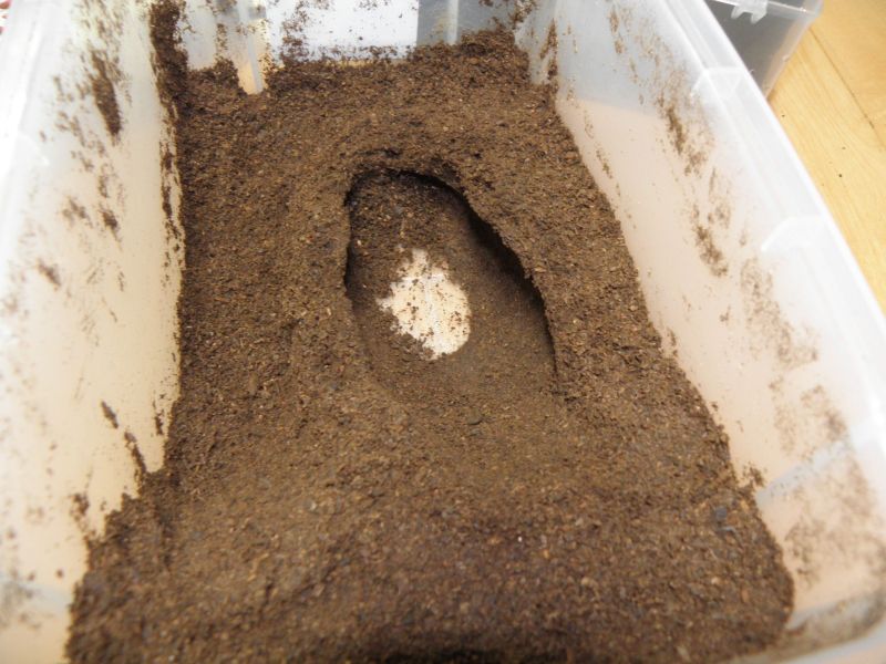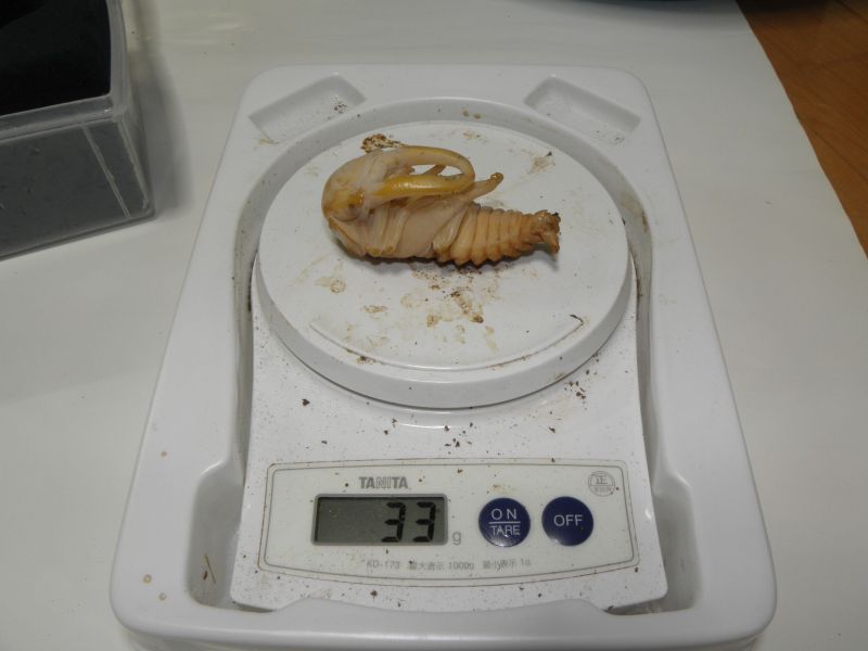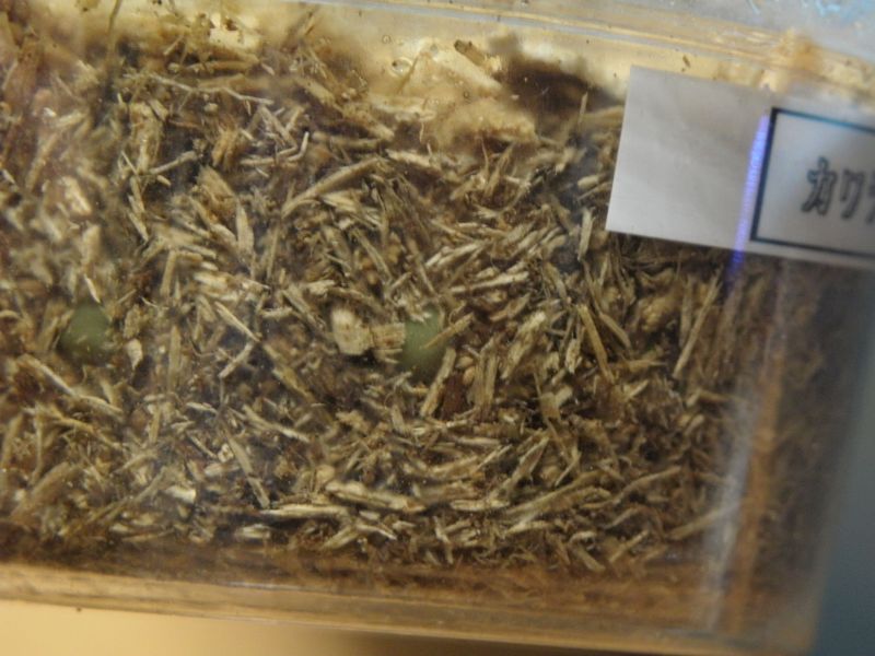 タラ♀は卵を守る?というのはよく言われているから、おそらくは卵を守っているんだろうけど こうも一箇所にとどまってると個数を産めないんじゃないか? というわけで、刺激を与える&(卵を)守る必要を無くすために採卵してみた。 採卵結果はというと・・・4個^^; 一ヶ月かけた割には少ない・・・・ ちなみに、タラの材産卵に成功したのは今回が初めてだったりする^^; いつもは菌床を使うか、。初令~2令取り出しがメインだった。 今回、初めて緑の卵を見ることができた。 産卵数が少ない原因はいろいろ考えられるけど、 予測として3つ ①セットの前半期にカワラ材がかなりの水を吐き、湿度が高い状態になってたこと なんとなくだけど、タラにしてもローゼンにしても、 ケース内が比較的に乾燥傾向にあるときのほうが産卵している気がする。 ②材の菌活性が高かった 材にしても菌糸瓶にしても活性の高い状態よりは 落ち着いた状態を好む傾向もある気がする。 実際、菌活性の高い詰めて2週間程度のカワラ菌床に入れたセットでは 潜ったけどすぐに出てきてしまって。、 今回の材はだいぶ菌糸活性が弱くなっていた。 とりあえず、材に新たな誘導穴を開けて、再び♀を突っ込むことにした。 どっちみち、今の状態で確実に生むことは分かったし、 産卵スイッチの入った今のうちに個数を稼いでおきたい。