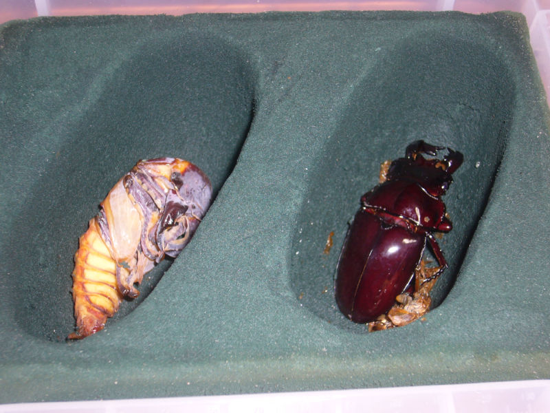 とはいえ、セアカは我が家の外国産クワガタ第一号だっただけに、思い入れも結構ある。 もっとも、最初に育てたセアカ(♀)が・・・実はマンディだった、 しかも直系の子供が♂二匹で累代不可能というオチがついてしまったこともあり、 このまま無事に羽化して欲しいところ。 どこからどうみてもセアカだし、 こちらの血統はちゃんと累代する予定。 まあ、普通種だからそこまで気合入れるのも・・・ って人もいるとは思うけど、 好きなクワガタであることに変わりないので^^ この子は、ここまでに約一年だけど、 菌糸瓶2本というエコロジーな子。 つ~か、単純に俺が餌交換のタイミング逃しただけともいえるんだけど^^; 二本目の菌糸瓶が予想以上に劣化が遅かった上に、綺麗に居食い状態になっていたから、 あえて交換せずに引っ張ってみた個体。 特に大きくもなく小さくも無く、70~80mmってところになるんじゃないだろうか? PR | カウンター